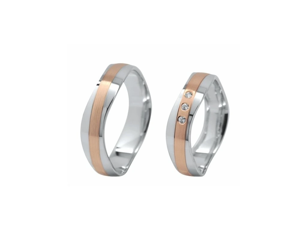 Snubní prsteny z bílo-červeného, 14-karátového zlata.Dámský prsten je ozdoben buď zirkony nebo brilianty.Prsteny lze objednávat v různých velikostech.
