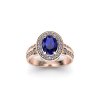 Úchvatný prsten s přírodním modrým safírem ovál 6x8mm a brilianty 0,010ct G/SI1 36 x ø1.3mm. Tento bohatě zdobený prsten s přírodními kameny bude luxusním doplňkem na ruce každé ženy. Kombinace tmavě modrého safíru s brilianty ještě více podtrhne jeho krásnou modrou přírodní barvu.