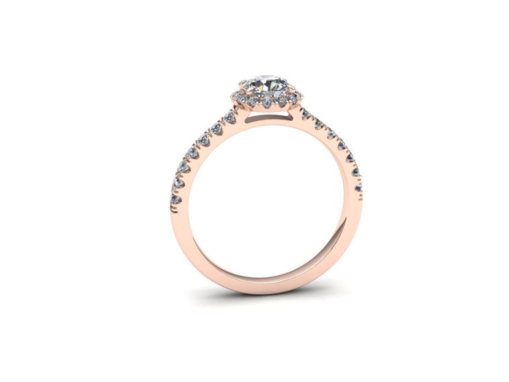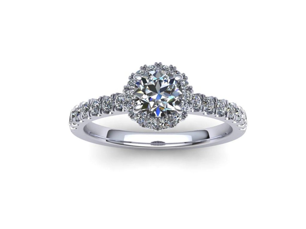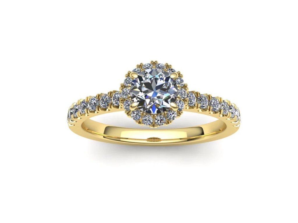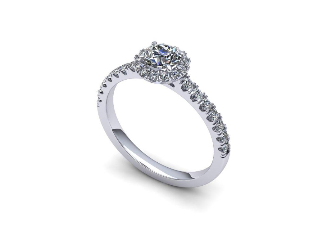 Luxusní zásnubní prsten s výrazným středovým briliantem, obklopený jemnými drobnými kamínky dookola, který zaujme svou nadčasovou elegancí. Obroučka prstenu je po obou stranách vysázená brilianty, které zvýrazňují krásu velkého přírodního broušeného diamantu uprostřed.