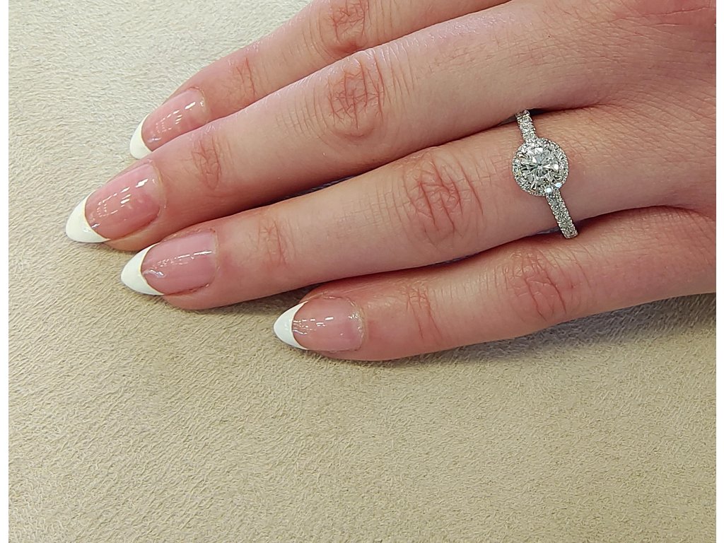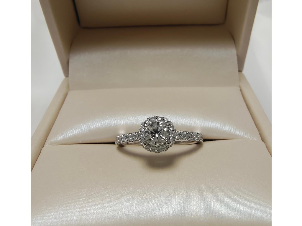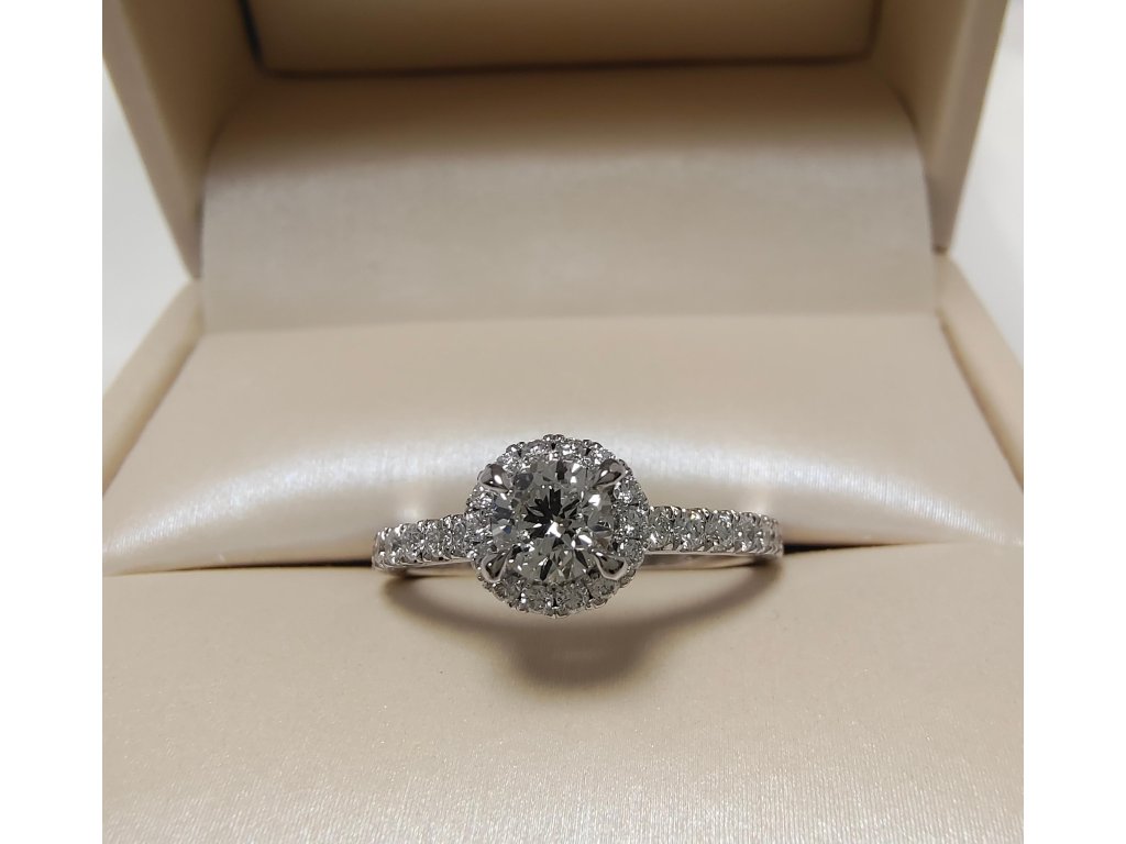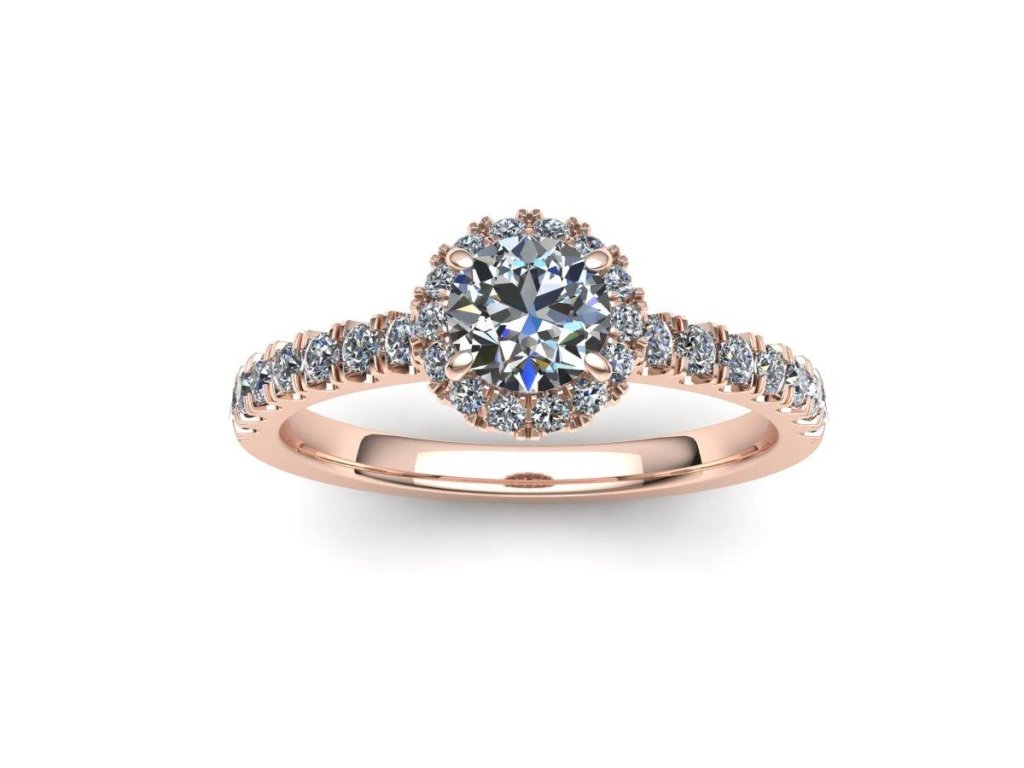 Luxusní zásnubní prsten s výrazným středovým briliantem, obklopený jemnými drobnými kamínky dookola, který zaujme svou nadčasovou elegancí. Obroučka prstenu je po obou stranách vysázená brilianty, které zvýrazňují krásu velkého přírodního broušeného diamantu uprostřed.